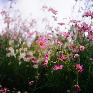 {Film: MamiyaFlex + Kodak Gold 120} Color image of pink wild roses taken at Longwood Gardens in Kennett Square, PA